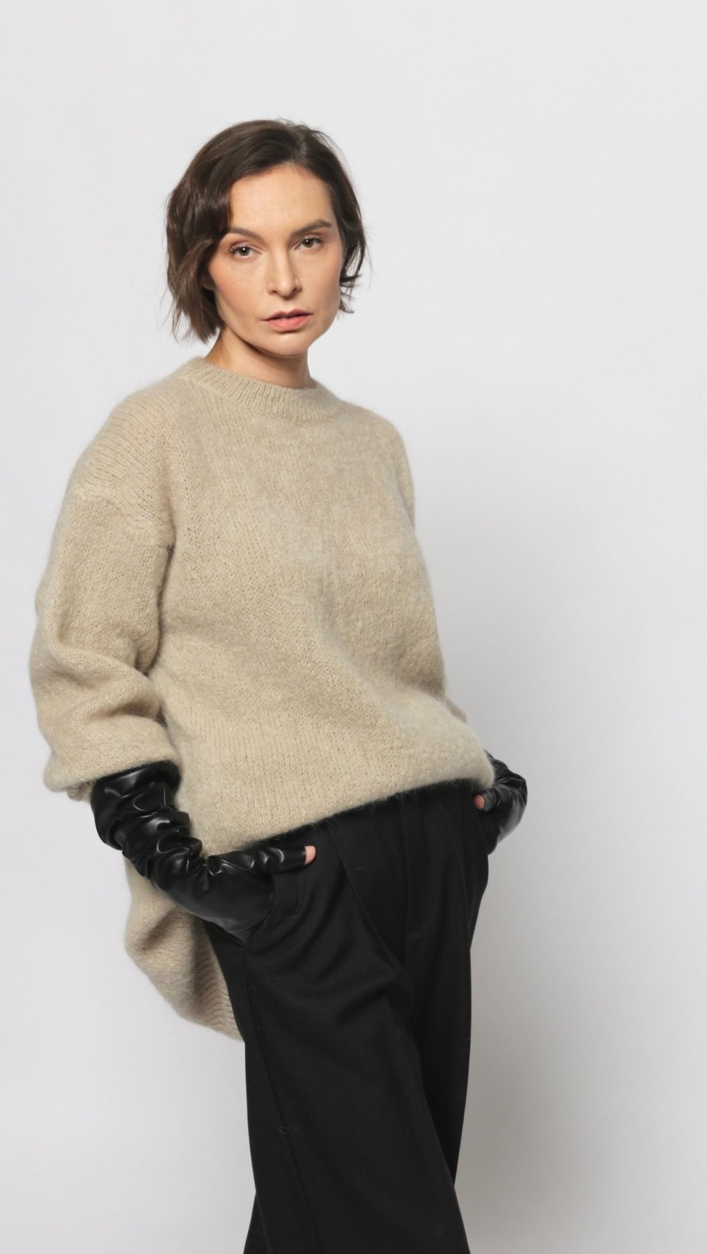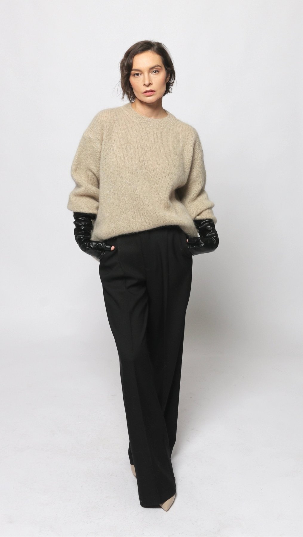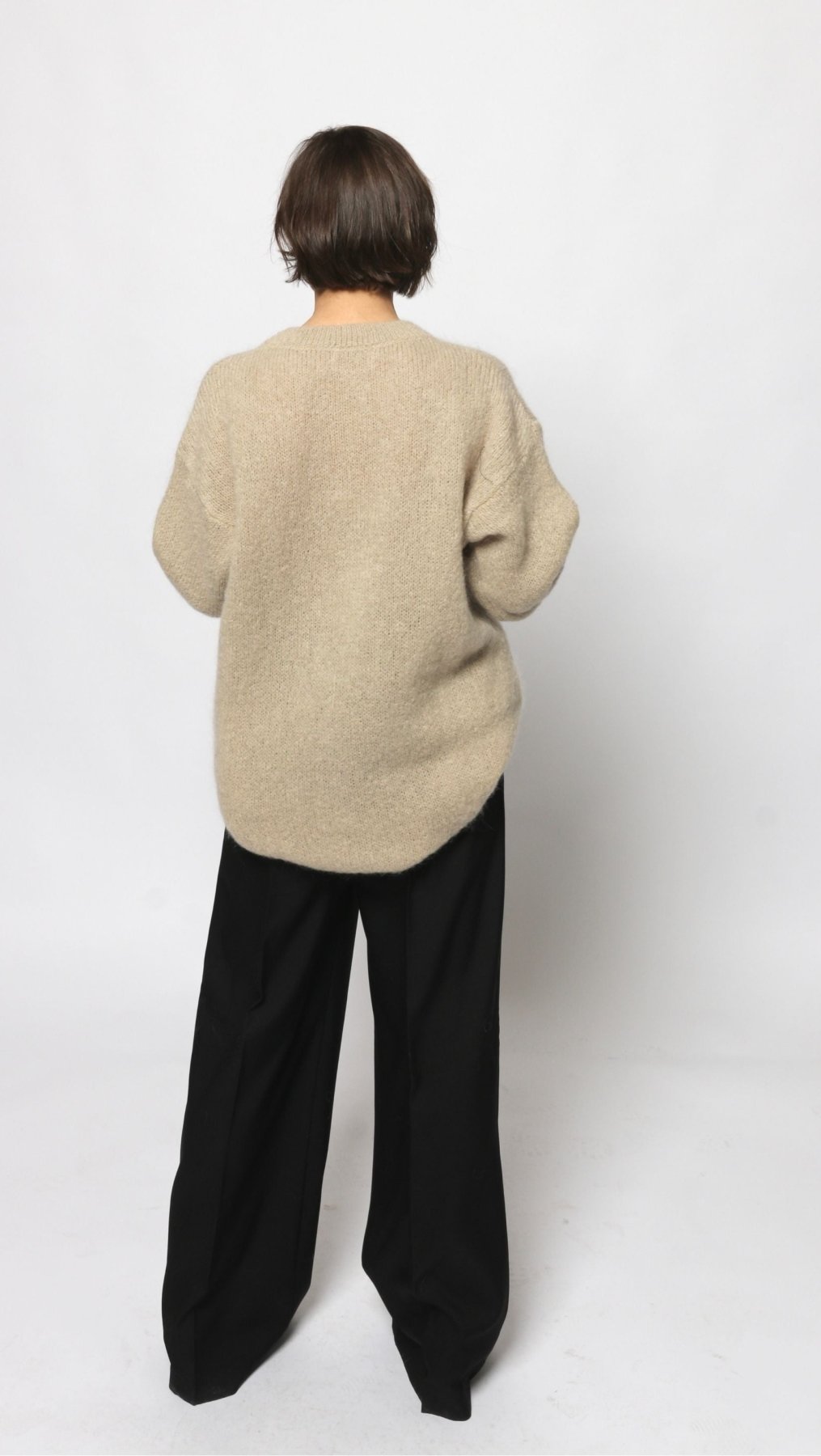 Long Mohair and Wool sweater in Grayish Beige color. Round neck, long sleeves.