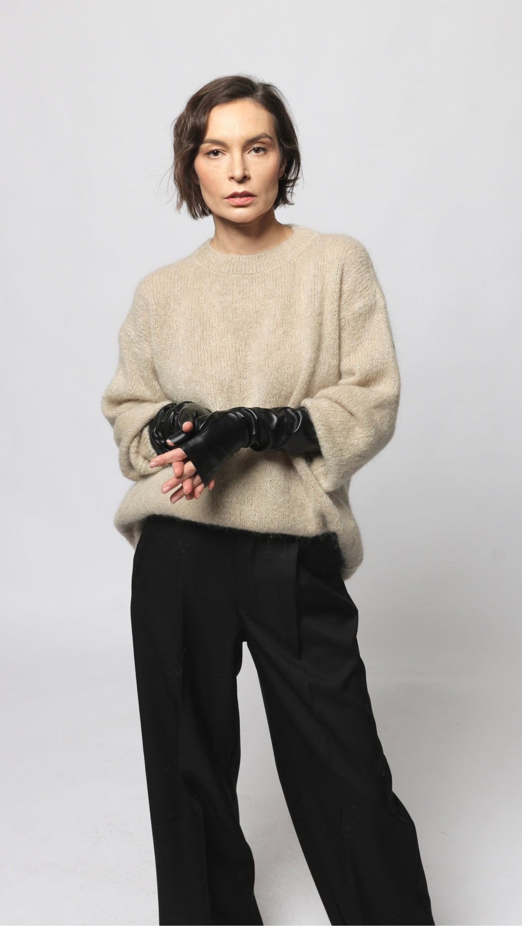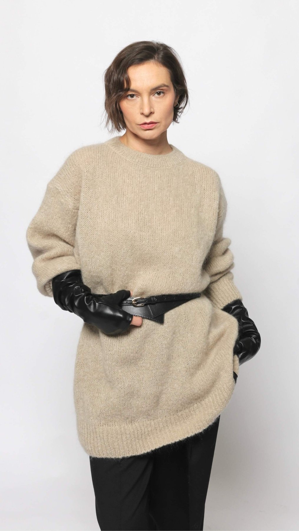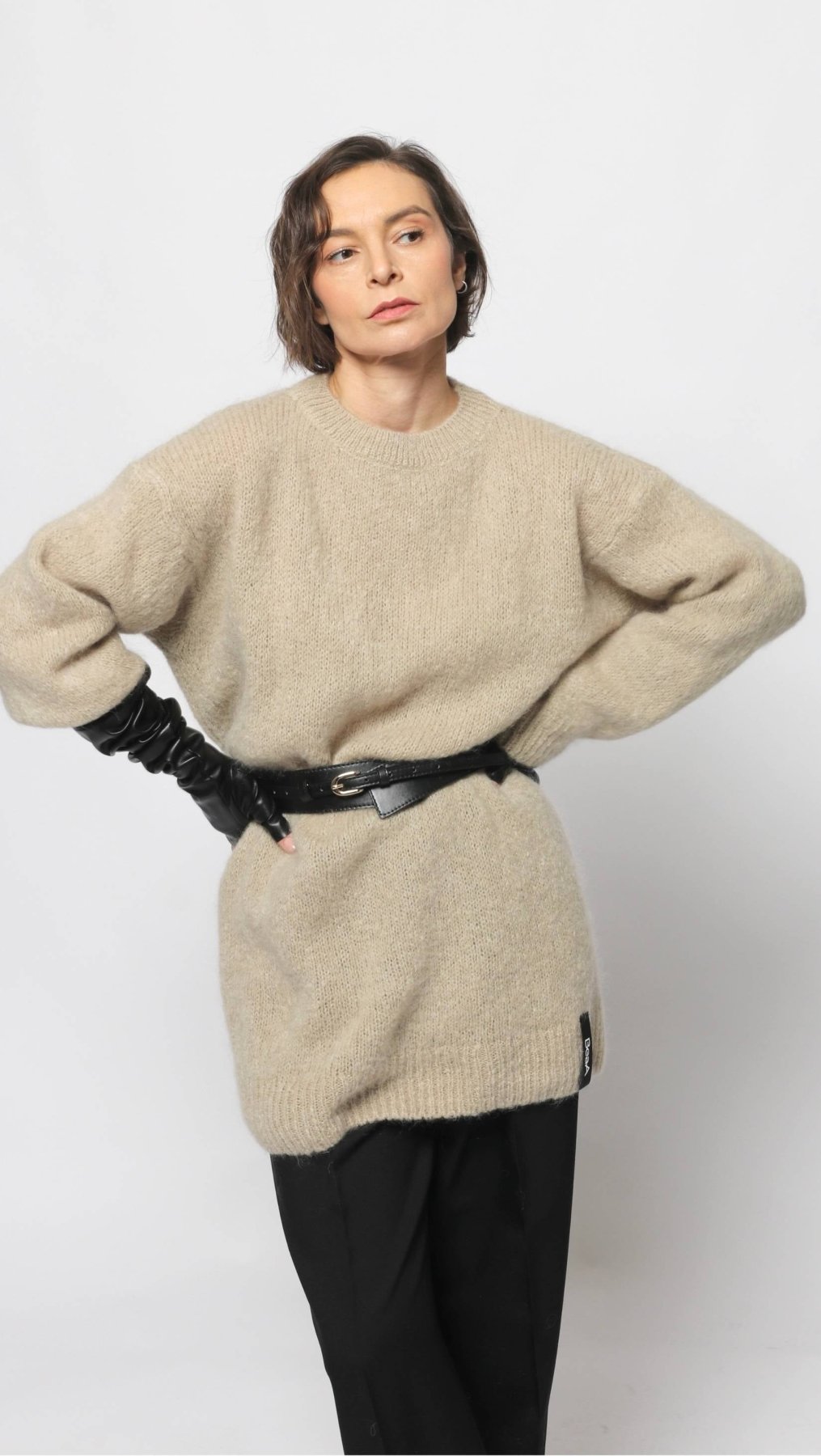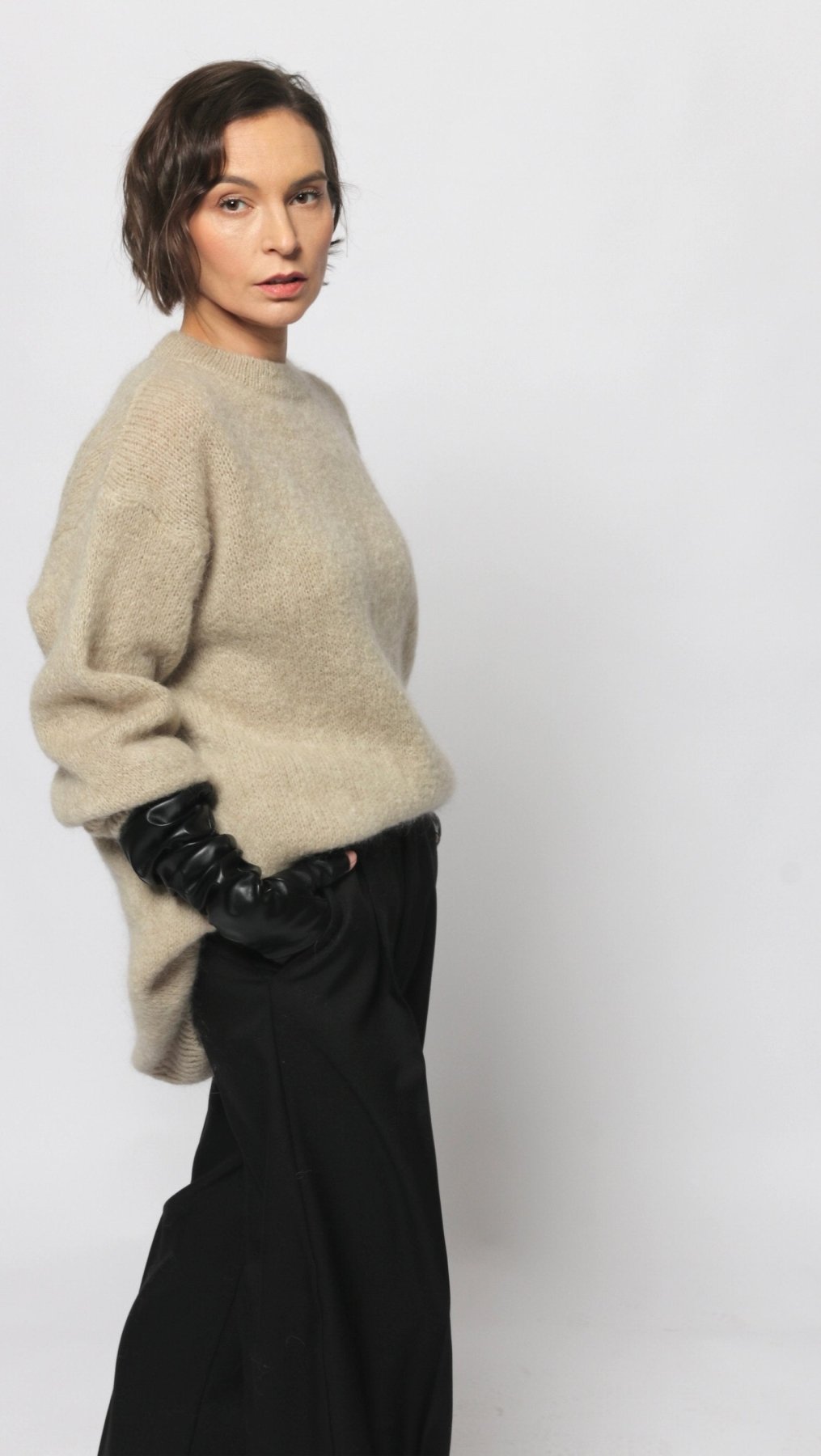 Long Mohair and Wool sweater in Grayish Beige color. Round neck, long sleeves.