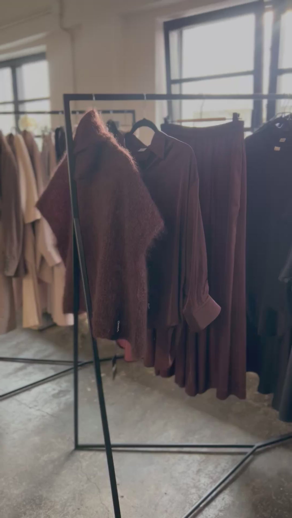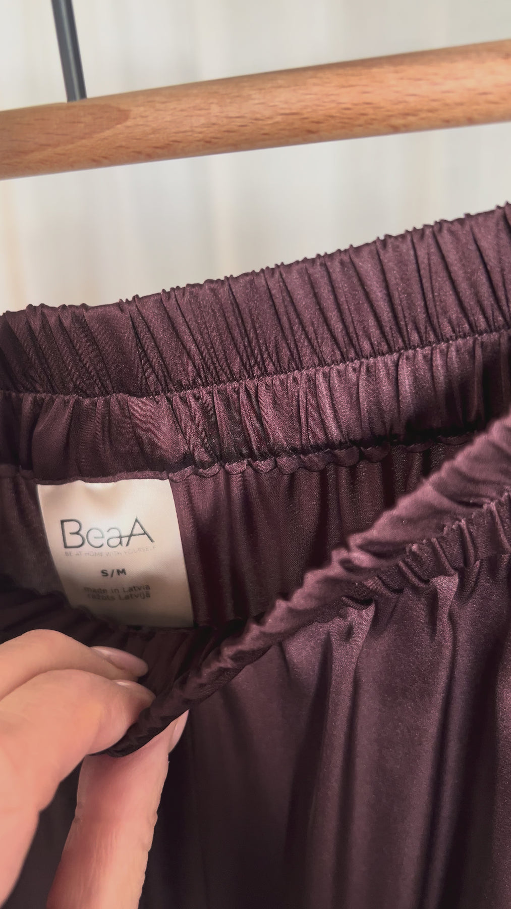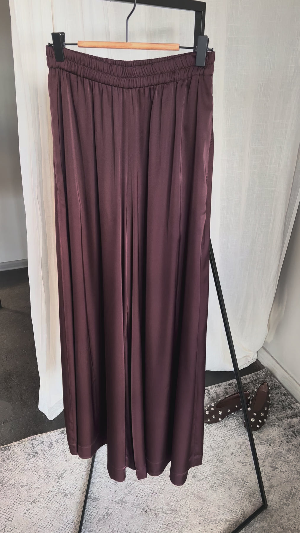 Silk palazzo trousers in Dark brown color with elastic waistband and side pockets.