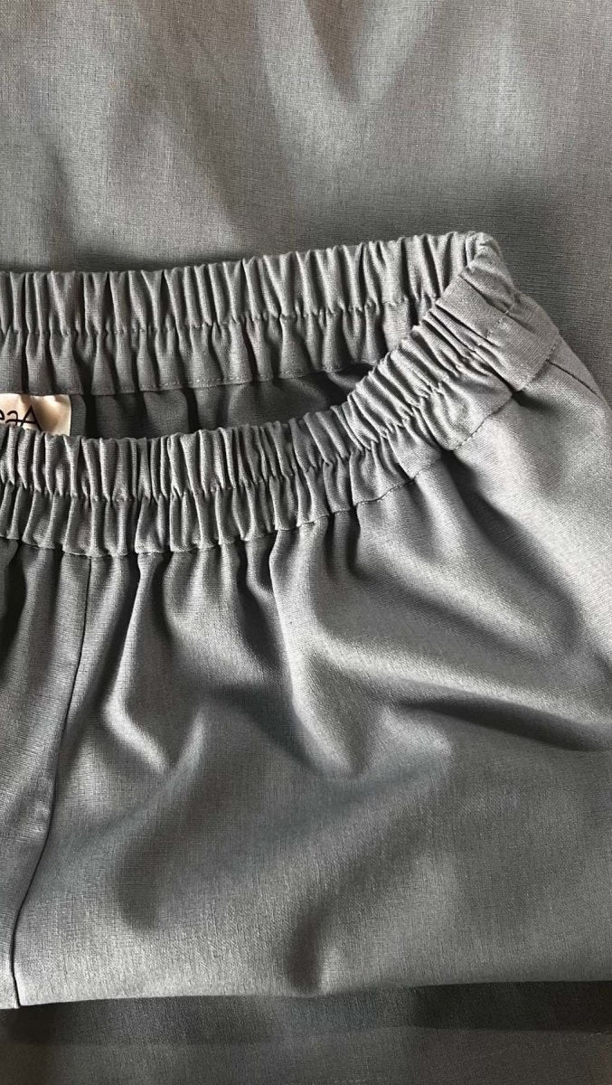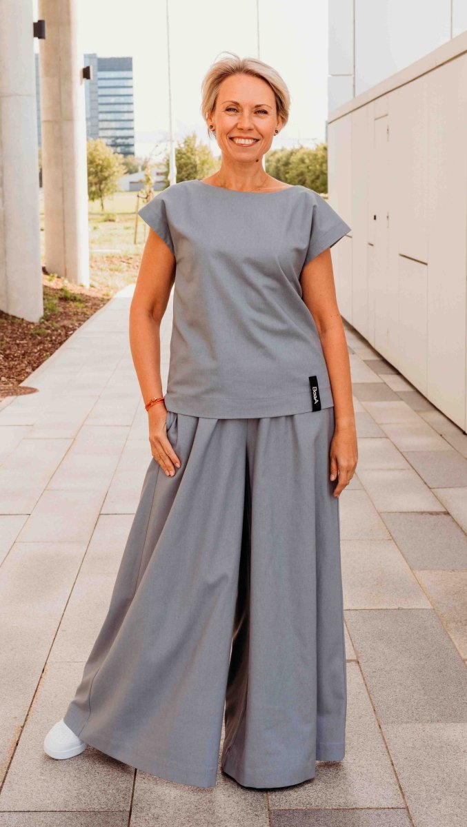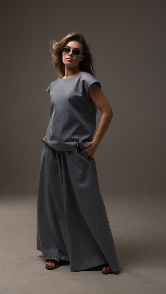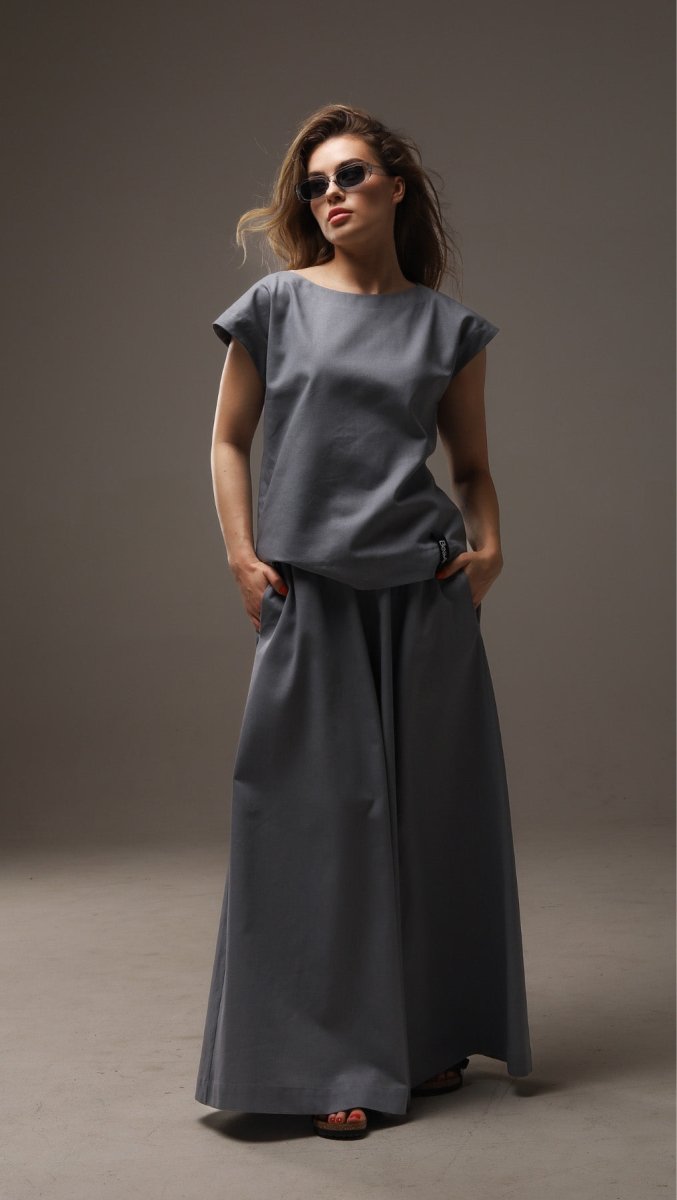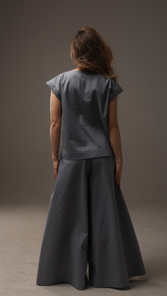 Linen Cadet Gray palazzo trousers with elastic waistband and side pockets.