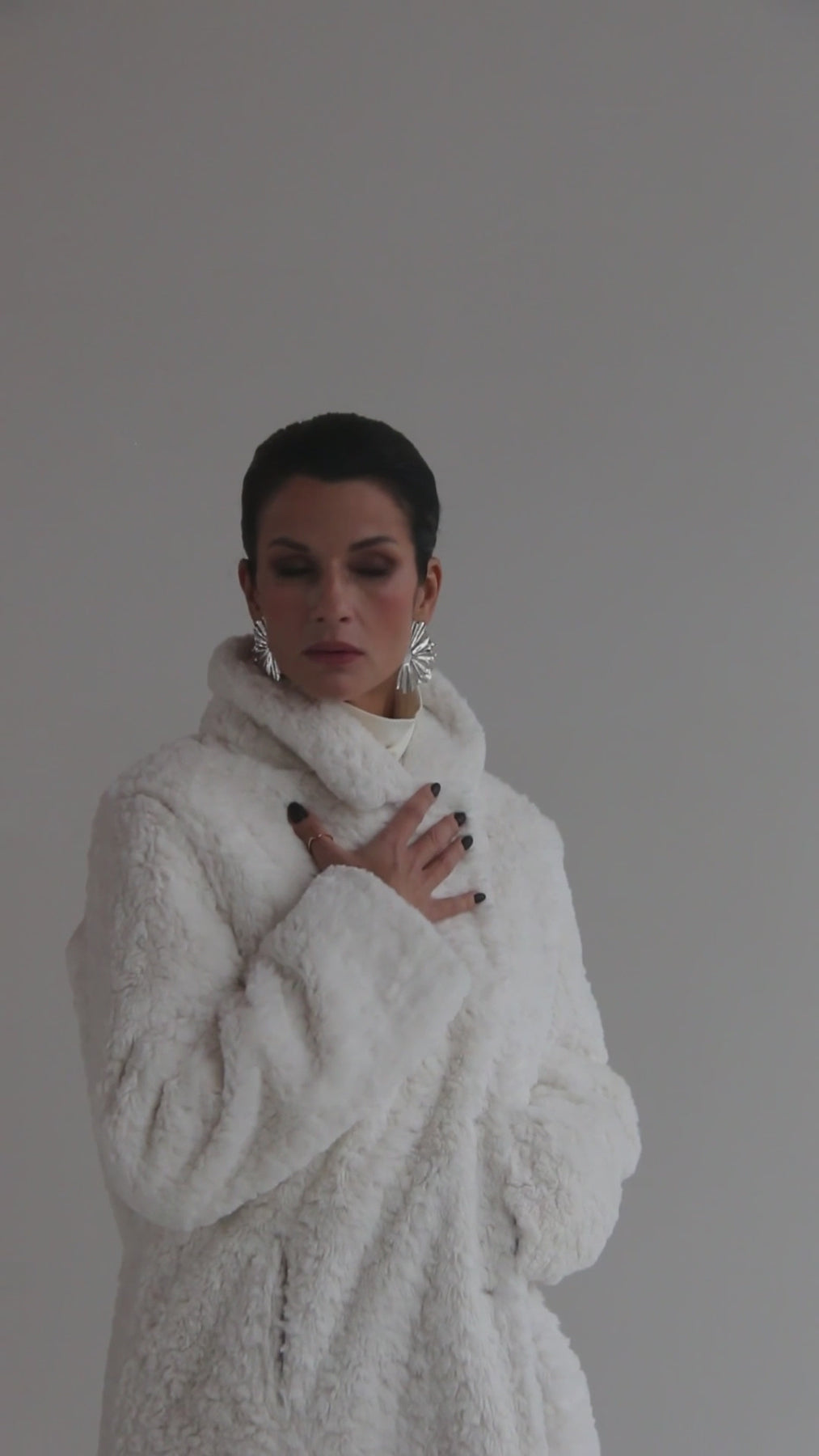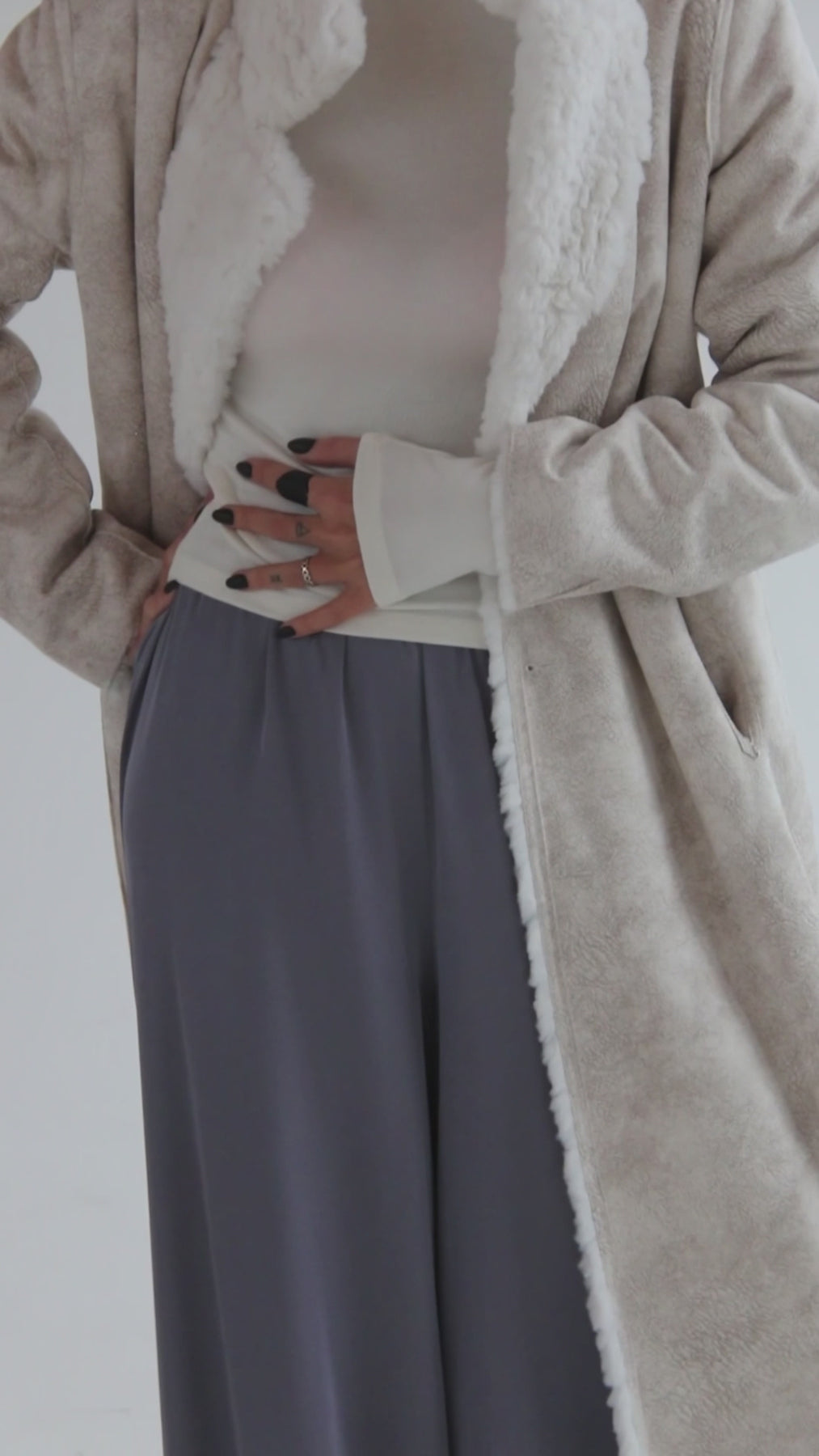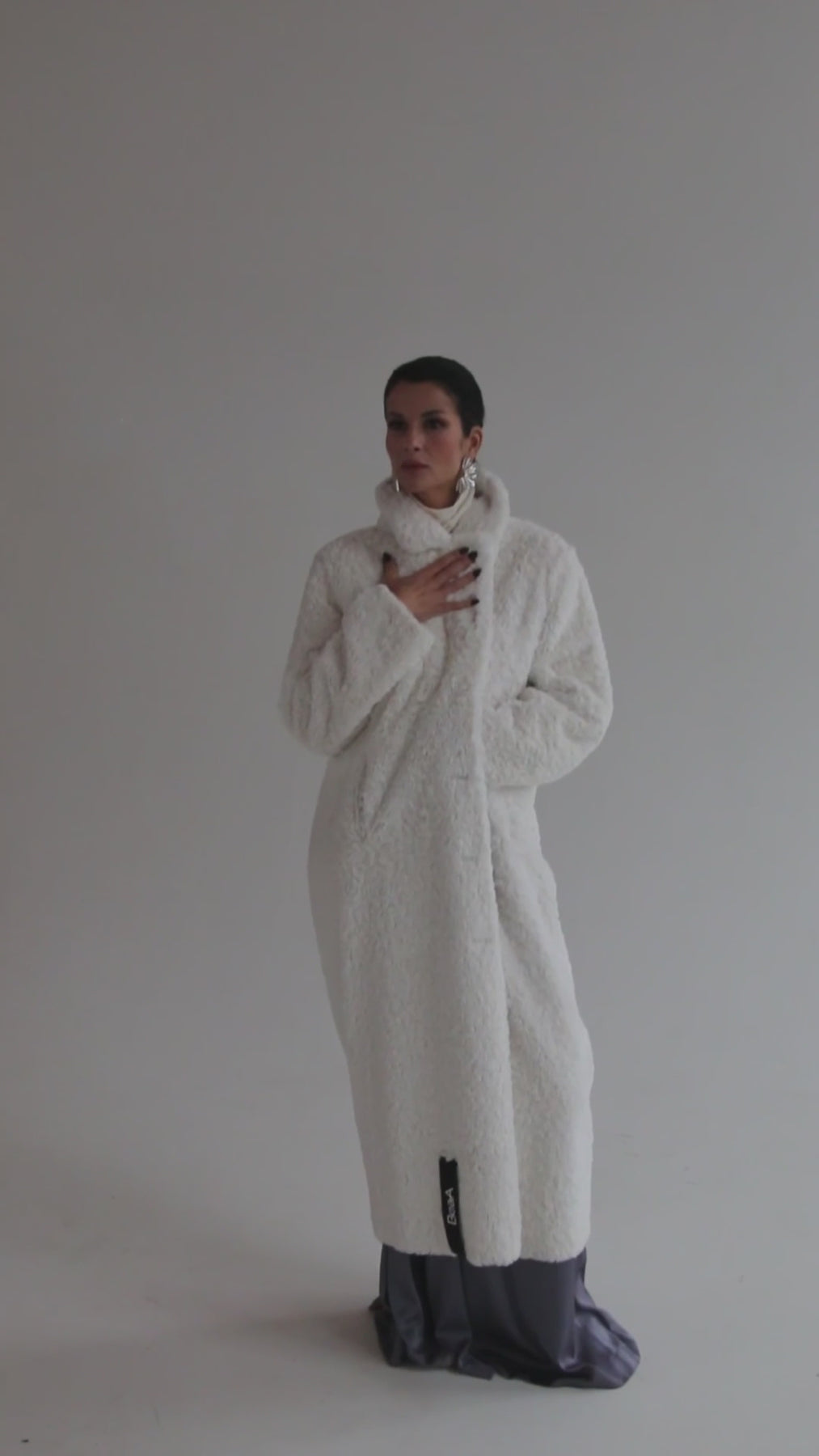 Midi garuma mētelis. Izgatavots no Eko kažokādas. Pogu aizdare. To iespējams valkāt no abām pusēm. Tam ir divas sānu kabatas, kas arī, apgriežot mēteli uz otru pusi, pielāgojas "izverot" tās uz otru pusi.
