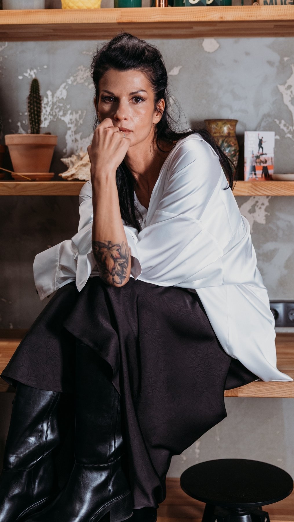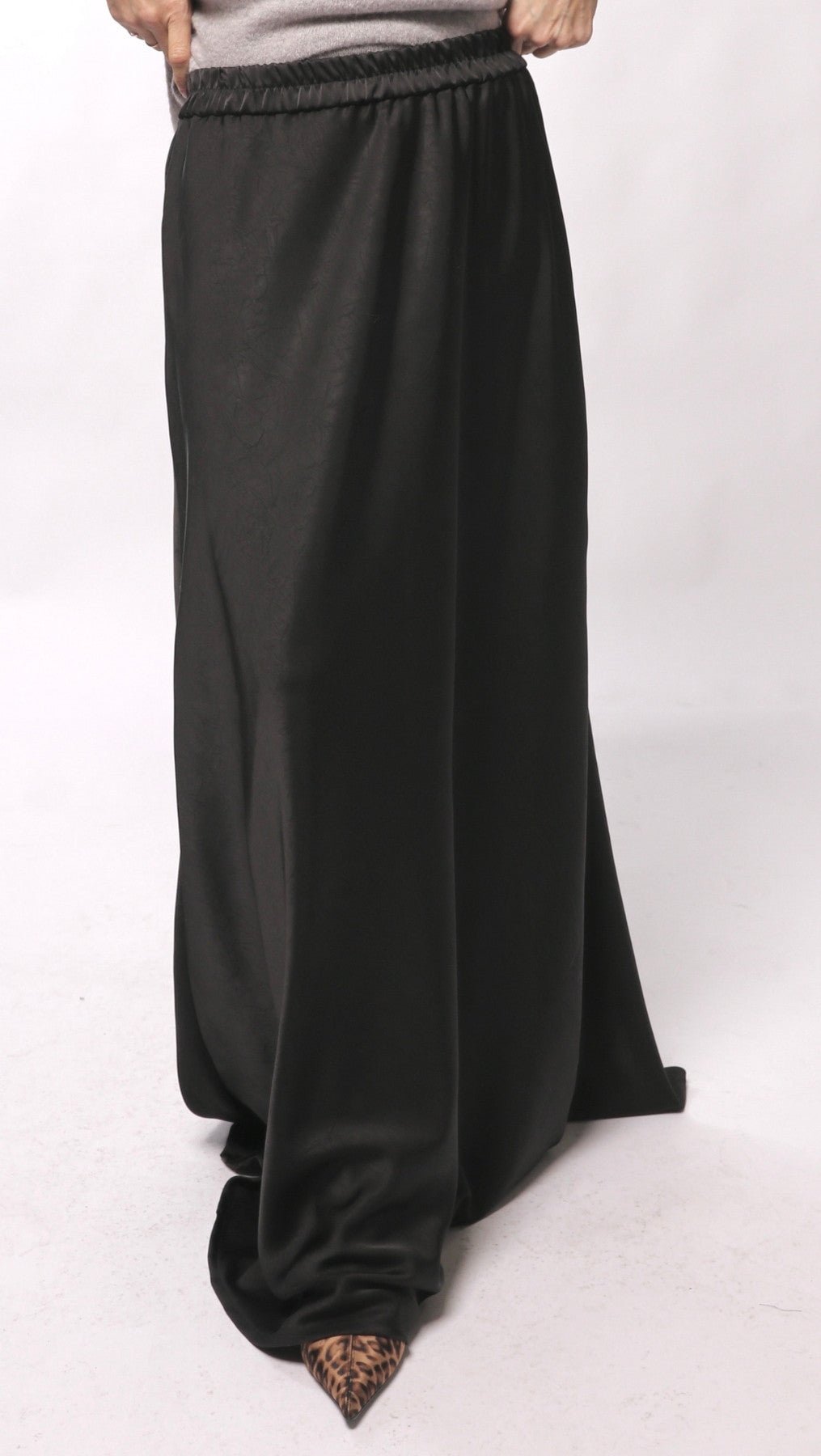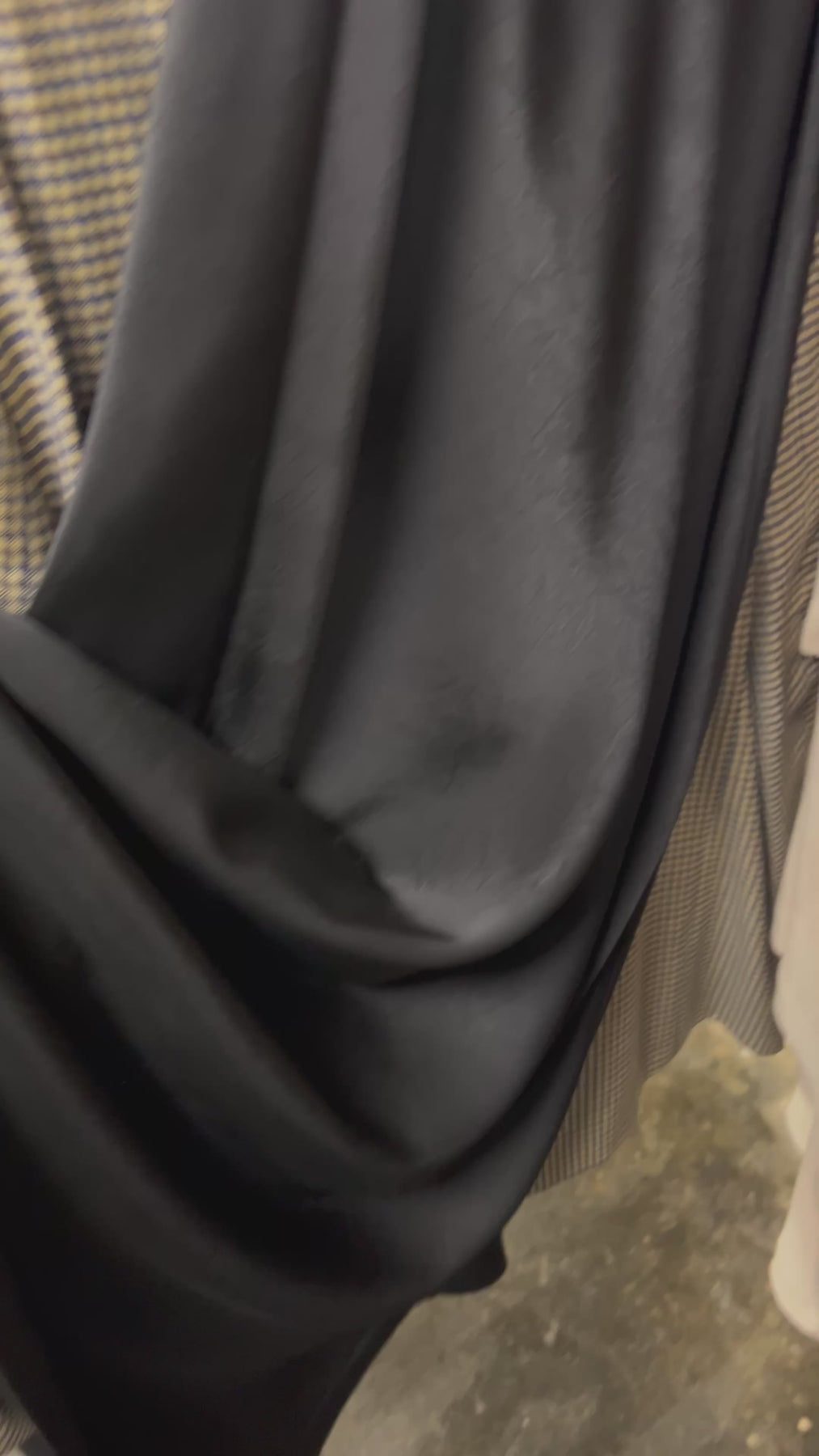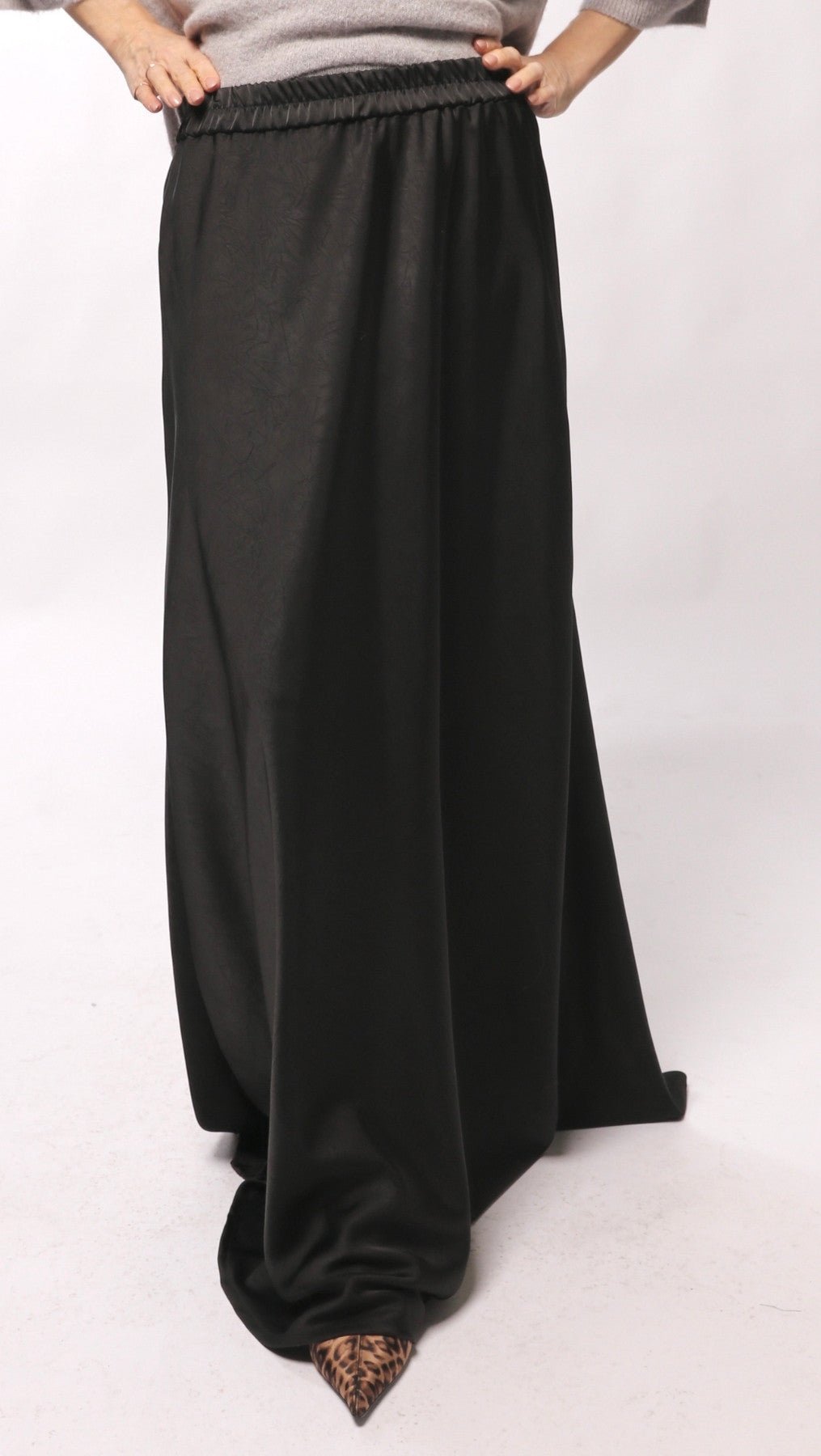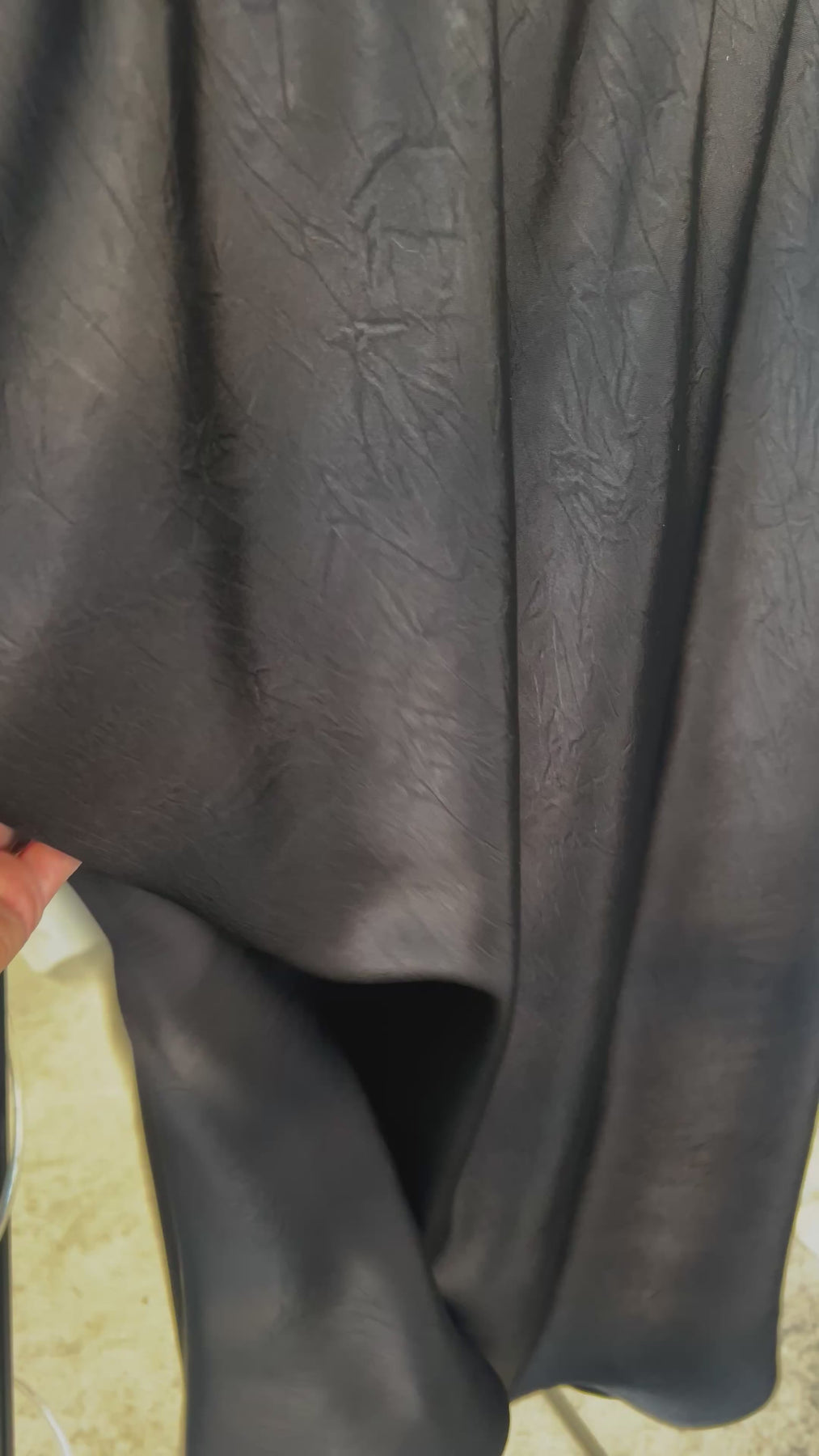 Slīpajā diegā šūti, gari svārki ar elastīgu gumiju jostasvietā. Audums ir krītošs, neburzīgs un viegli kopjams. Burzīts zīda satīns ir audums ar maigi krokotu tekstūru un delikātu spīdumu.