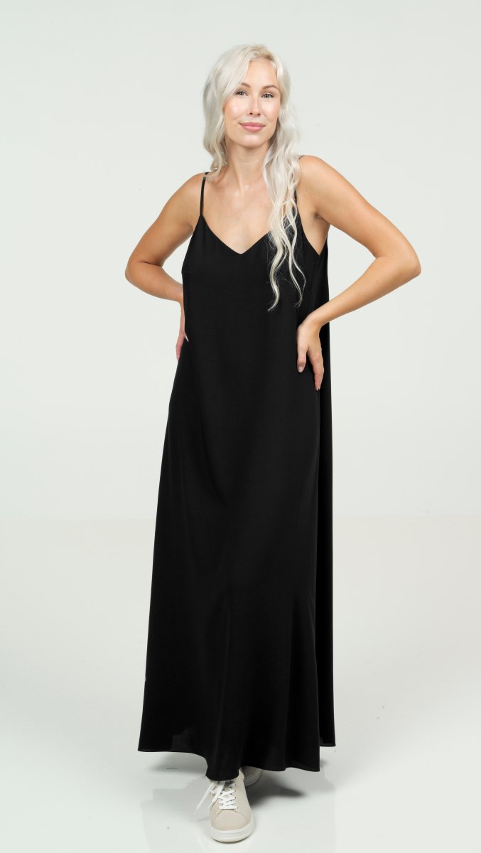 Black maxi dress with tiny, adjustable straps. Unlike the Open-back dress, it is possible to wear a bra under this dress.