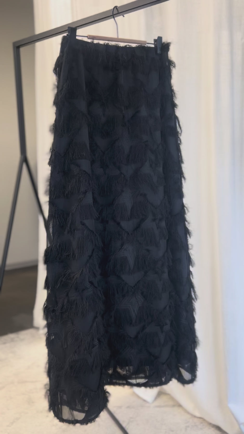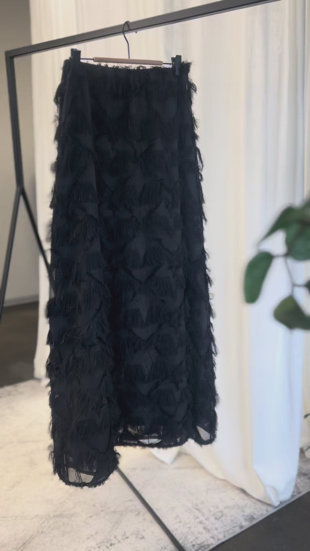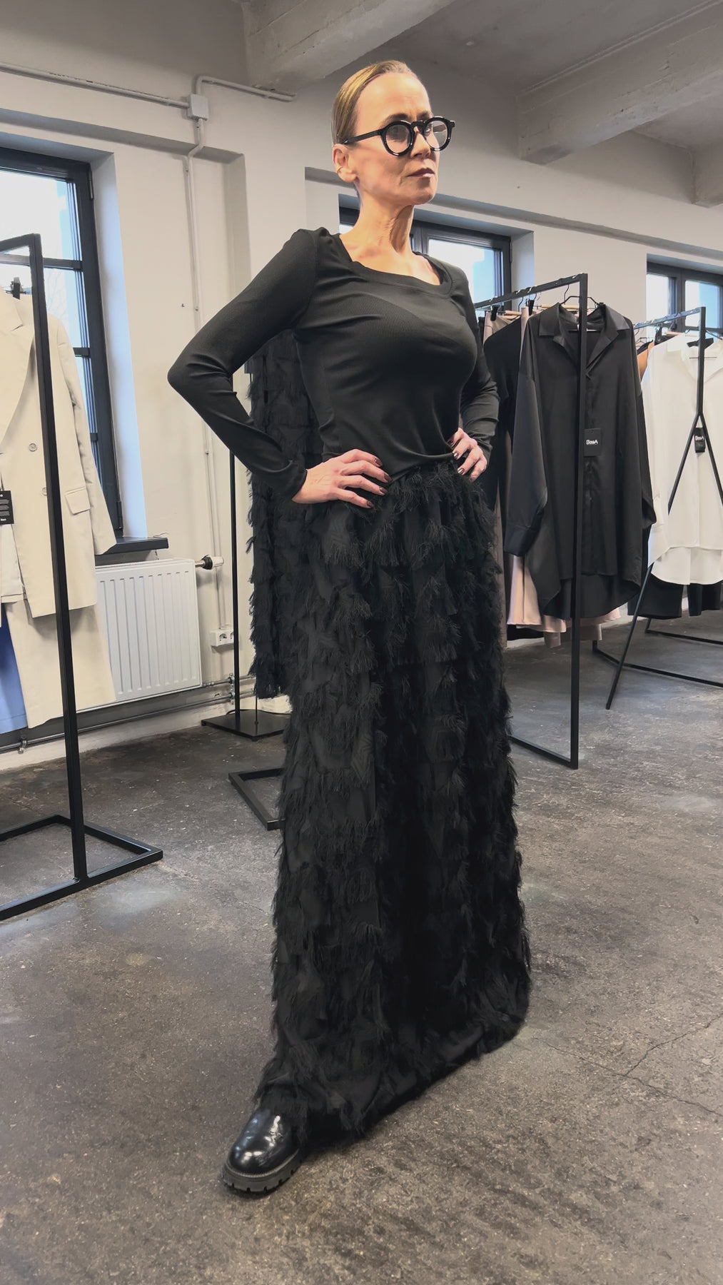 BeaA Black Line длинная юбка черного цвета. С эластичной талией, звездными мотивами и тонкими бахромой, которая движется при каждом шаге. Прозрачная ткань, наложенная на подкладку. Идеально для предстоящих праздников – когда хочется чувствовать себя женственно, но без лишней вычурности.