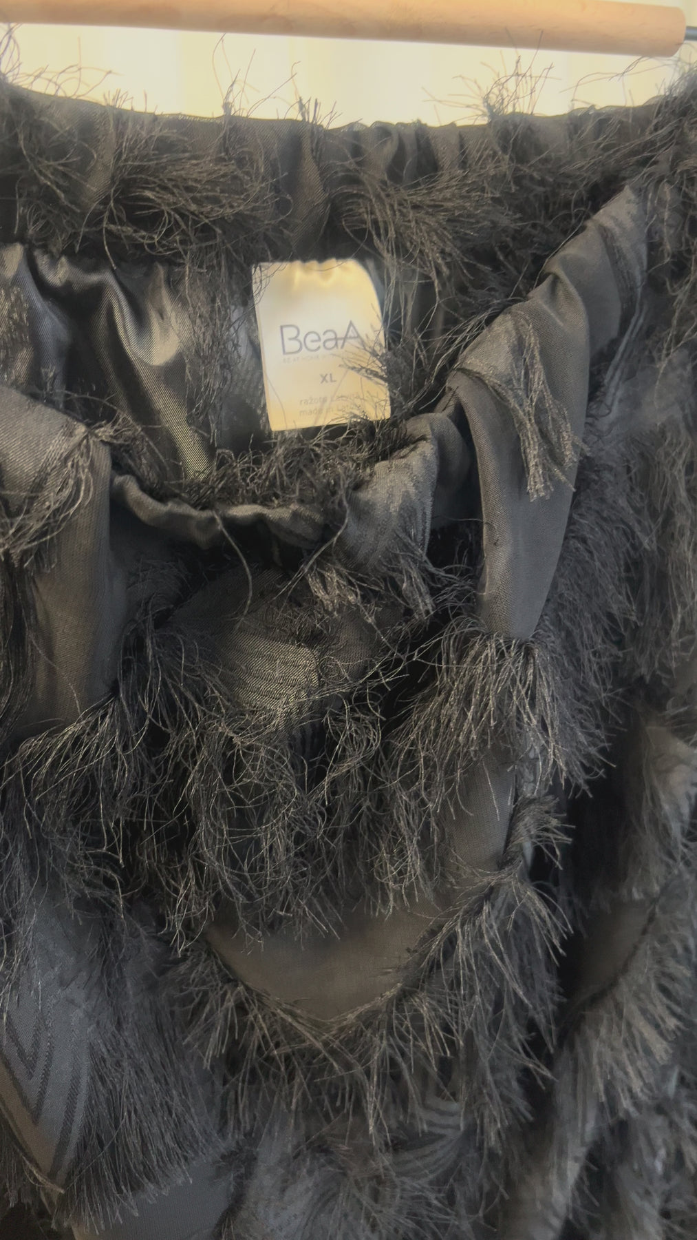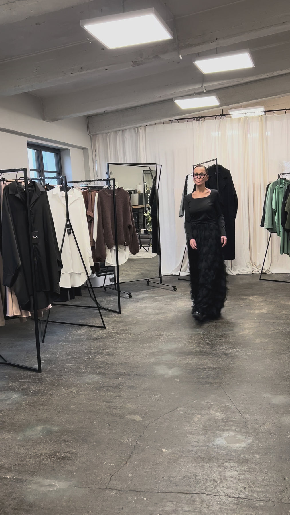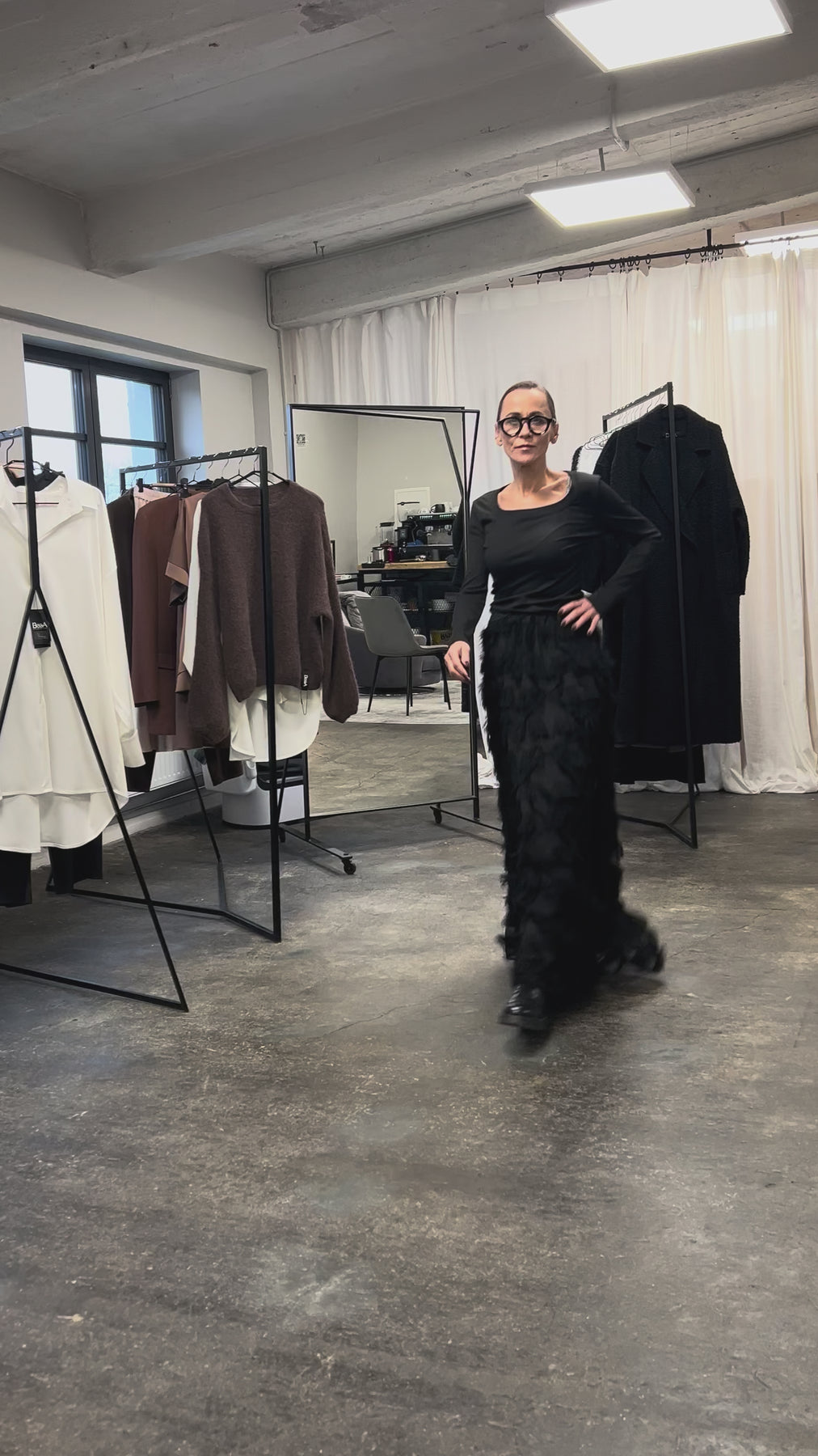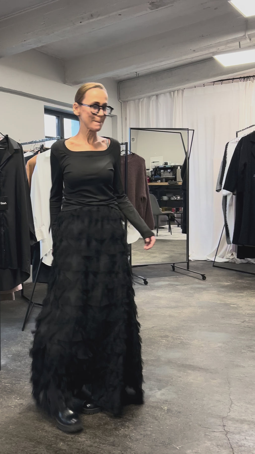 BeaA Black Line длинная юбка черного цвета. С эластичной талией, звездными мотивами и тонкими бахромой, которая движется при каждом шаге. Прозрачная ткань, наложенная на подкладку. Идеально для предстоящих праздников – когда хочется чувствовать себя женственно, но без лишней вычурности.