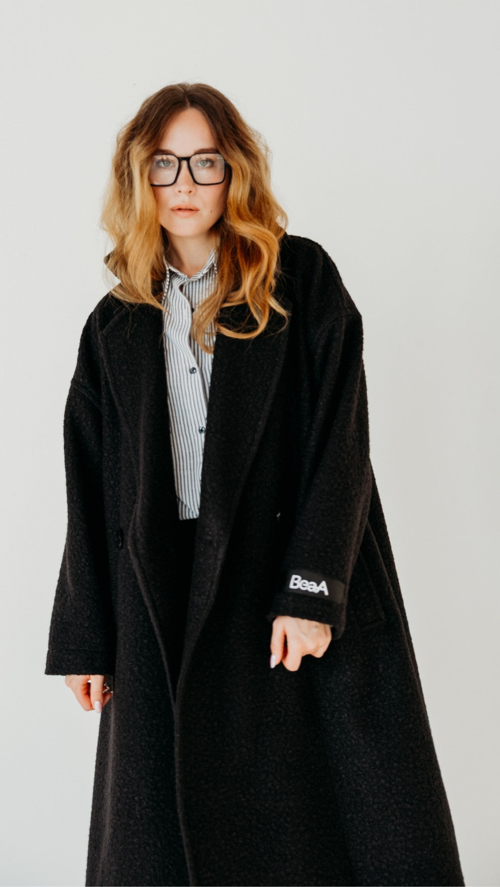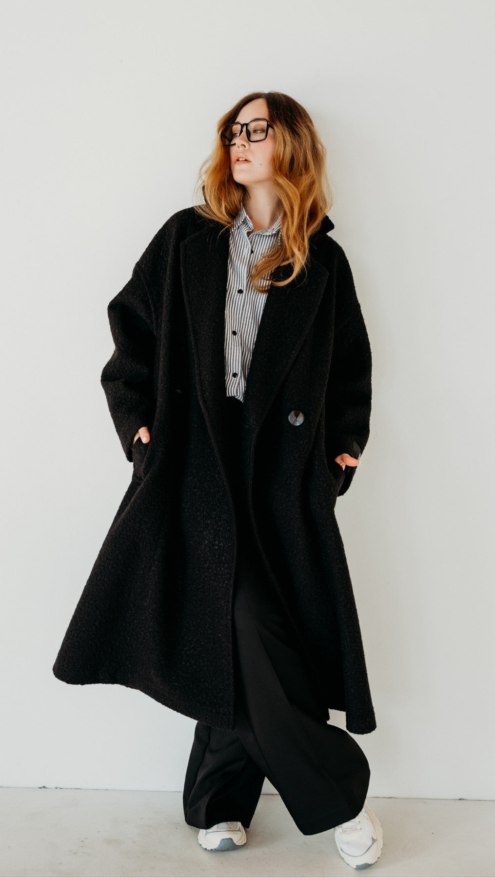 Длинное пальто оверсайз с классической застежкой на пуговицы и практичными боковыми карманами. Элегантно и удобно, идеально подходит для многослойности.